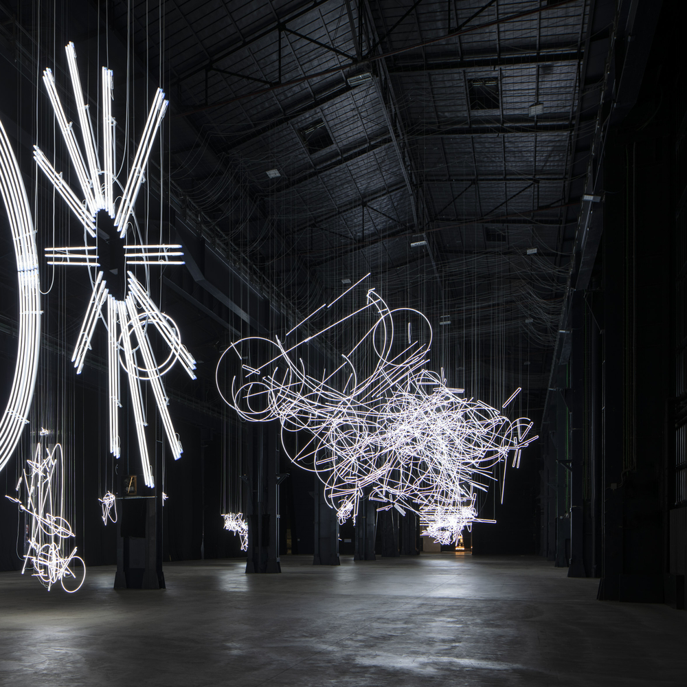 The Welsh artist Cerith Wyn Evans explores “polyphony, superimposition, layers, levels, the occluded, and the visibility of the mask.” That’s a pretty heady list but in this exhibition it all comes down to light and sound, waves and pulses, sculptures like neon graffiti, caligraphic skywriting, glowing columns, illuminated script that hovers in space. For his largest solo exhibition yet, Evans isolates energy and the temporal. —E.C.
