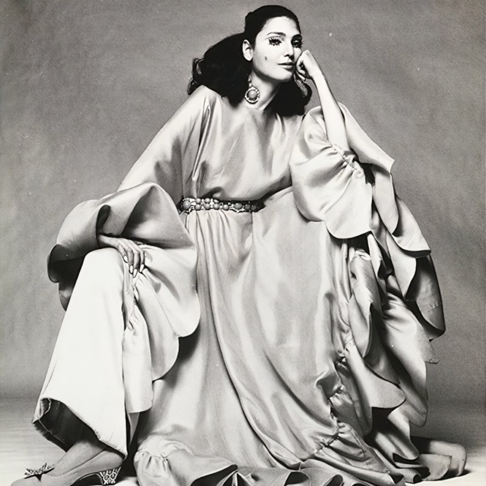 Benedetta Barzini, pictured with a Valentino poncho and Coppola e Toppo jewelry, photographed by Gian Paolo Barbieri in 1969 for Vogue.
