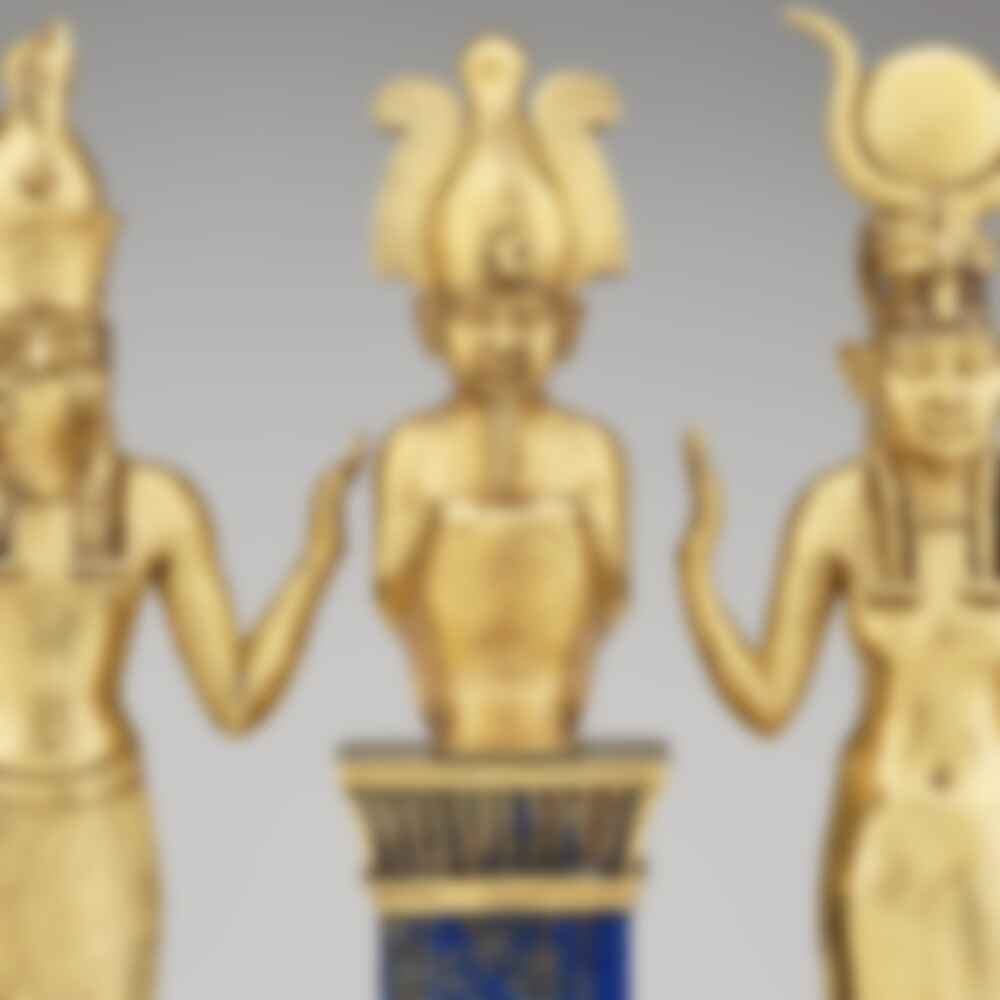 A detail from Triad of Osiris, Horus, and Isis, a sculpture from the Third Intermediate Period, Dynasty 22, reign of Osorkon II (about 872–837 B.C.).