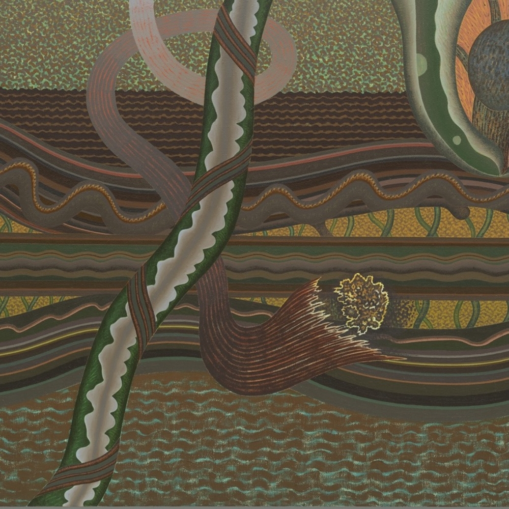 With their earthen midcentury colors, stylized biomorphic shapes, and a fallopian feeling of organic infrastructure, the paintings of Evelyn Statsinger occupy their own place, or space. Statsinger was born in 1927 in Brooklyn, and in her early 20s moved to Chicago, where she lived and worked until her death in 2016. Statsinger found inspiration in forests and fields, observing animal and plant life. “Bits and pieces of specially observed things begin to represent the whole,” she said, “and juxtapositions of real things make imaginary combinations. Combinations are open and ambiguous to interpretation, so that the viewer may wander in the same state of grace as the painter.” These gorgeous abstractions are underpinned by a meticulous study of nature. —Laura Jacobs