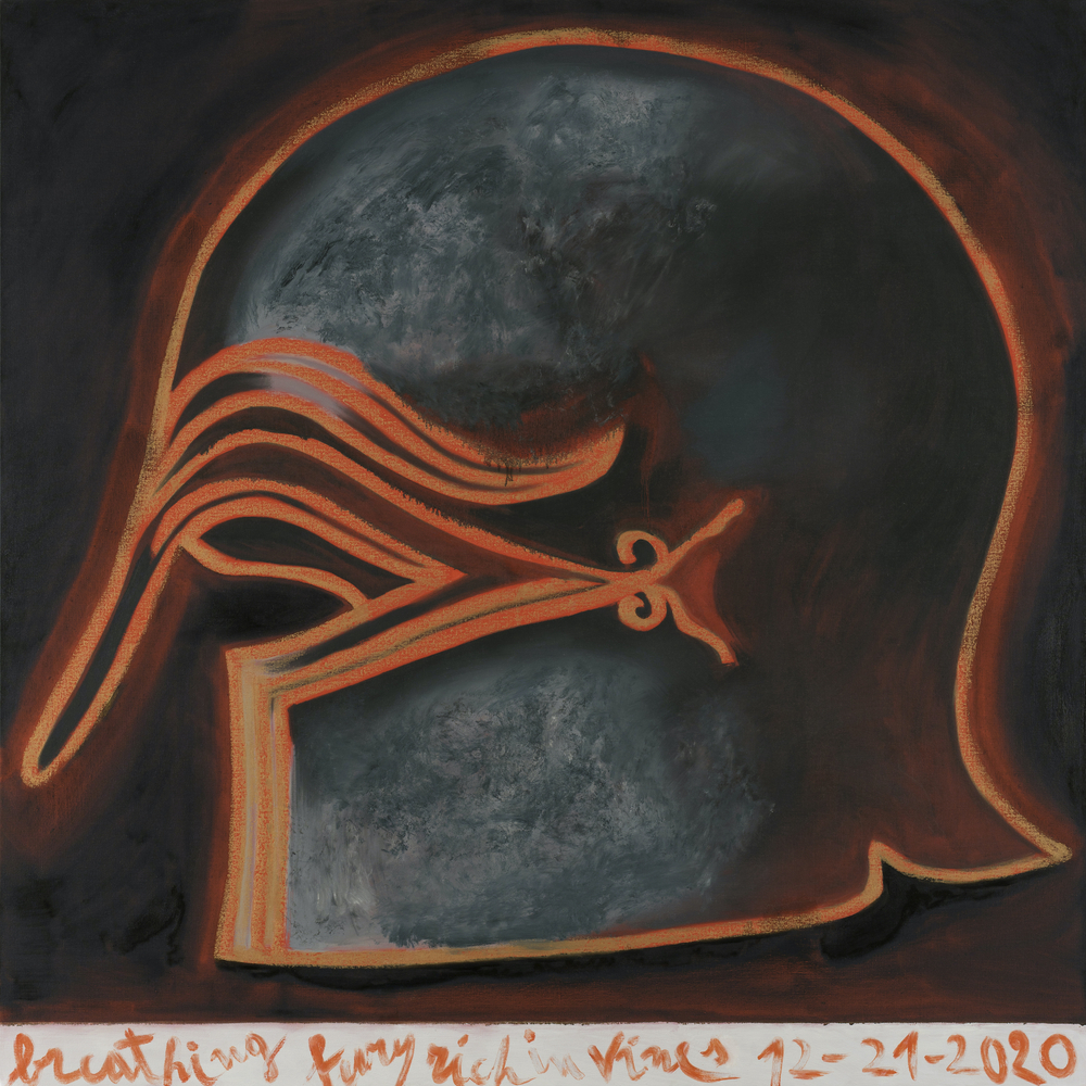 “I believe there is such a thing as an imagination shared by the different contemplative traditions,” the Italian artist Francesco Clemente has said. “My goal is to collect images and references from these traditions and connect them with the emotions from the present-day, and common experiences.” In this series, he does so by focusing on Homer’s Iliad, one of the foundational texts of Western culture. Clemente recognizes the narrative’s themes of fate, nature, recurrence, and the brutalities of conflict, and responds with nine monumental paintings—blackened, somber—each dominated by a classical Corinthian helmet and signed with a fragment of Homer’s poem. —E.C.