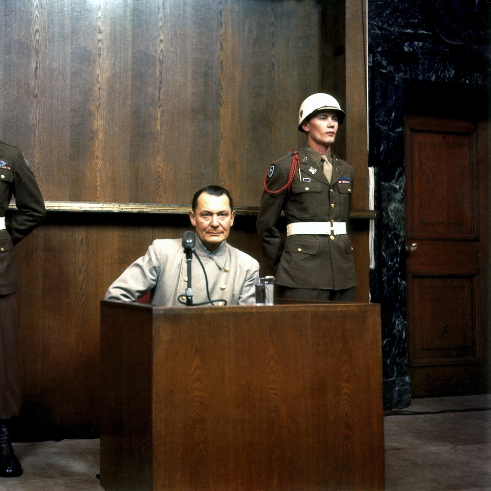 Commander of the Luftwaffe Hermann Göring, center, during cross examination at his trial for war crimes, Nuremberg, Germany, 1946. Photo: Raymond D’Addario/Galerie Bilderwelt/Getty Images.
