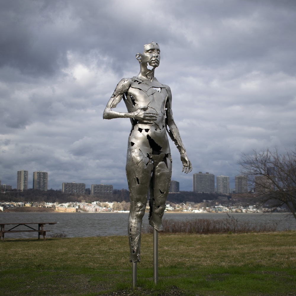 In the upper reaches of Manhattan’s Riverside Park, just north of the Riverbank sports complex, a messenger from the future has been present since last November and stands in state until August 26. When I first saw the silver sculpture, made of nickel-plated bronze by Sophie Kahn, I thought of Michael Rennie in The Day the Earth Stood Still—a humanoid in a silver suit. Still, it was hard to tell if this person was male or female or a mixture of both. The chest is flat, the stomach rounded, the face androgynous. Also, the back of the head is missing, as are the lower legs and bits of the body. It’s as if the hi-tech Borg beauty of Star Trek—Seven of Nine—were restructuring herself before our eyes. Or perhaps this form is like the nymphal skin of a cicada, the adult having squeezed out and moved on. Titled Portrait of t., Kahn’s artwork is actually based on a 3-D scan of the New York musician and performance artist tiger west, who carries the BRCA gene and recently underwent a mastectomy. The sculpture was commissioned by the the Art Students League of New York, as part of the Works in Public Program, presented in partnership with the New York City Department of Parks & Recreation. The “t” in the title is for tiger, but it also stands for transformation and transcendence. —Laura Jacobs