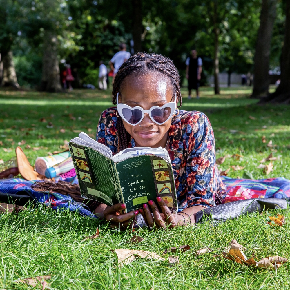 A festival goer enjoying her book.