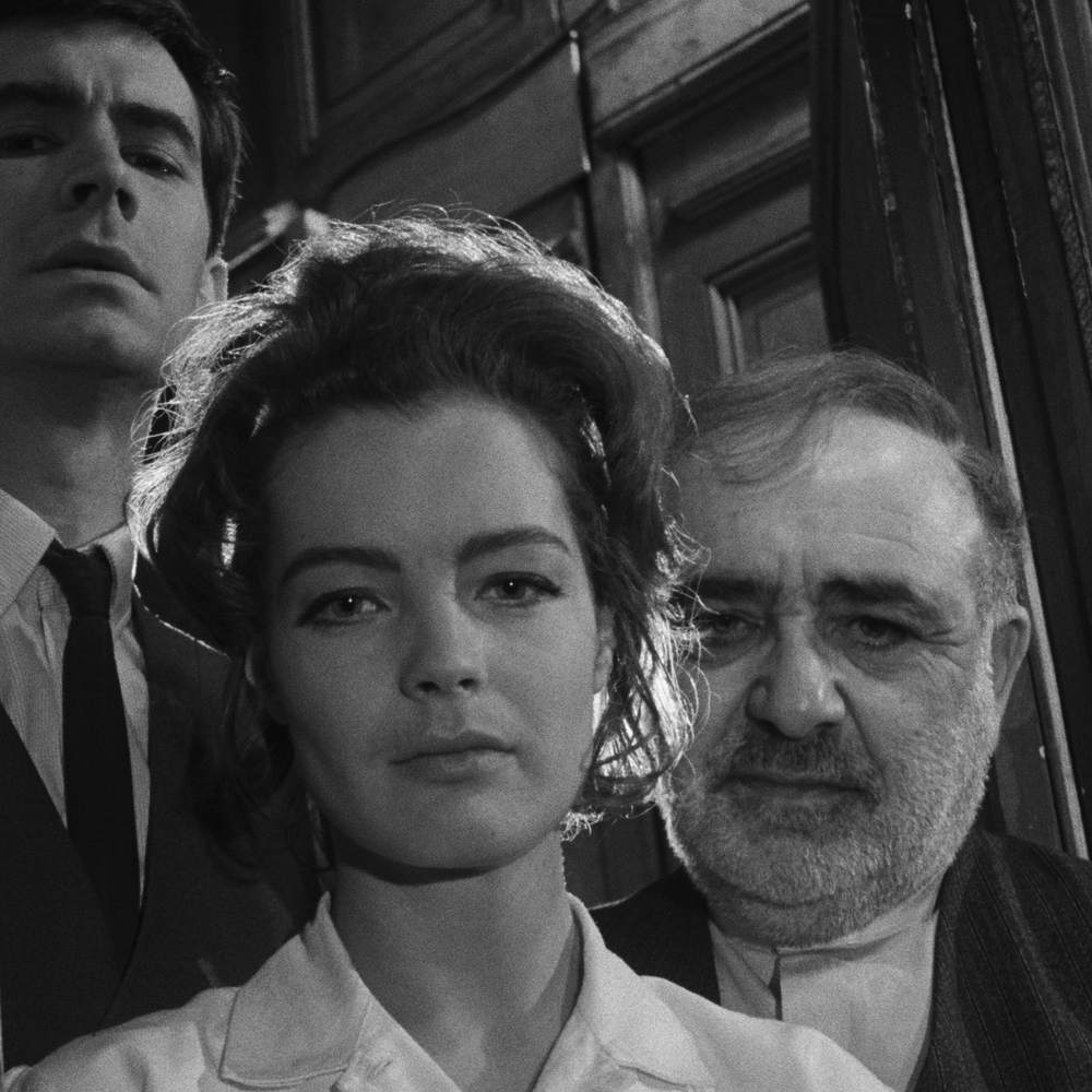 Anthony Perkins, Romy Schneider, and Akim Tamiroff in The Trial (1962), directed by Orson Welles.