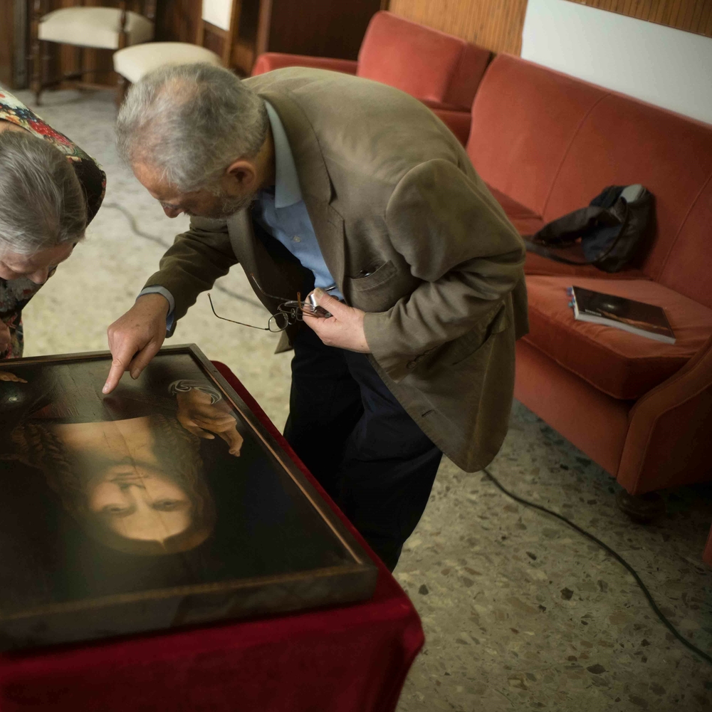 Examining the “Salvator Mundi,” in a film still from “The Lost Leonardo.” Photo courtesy of Sony Pictures Classics.