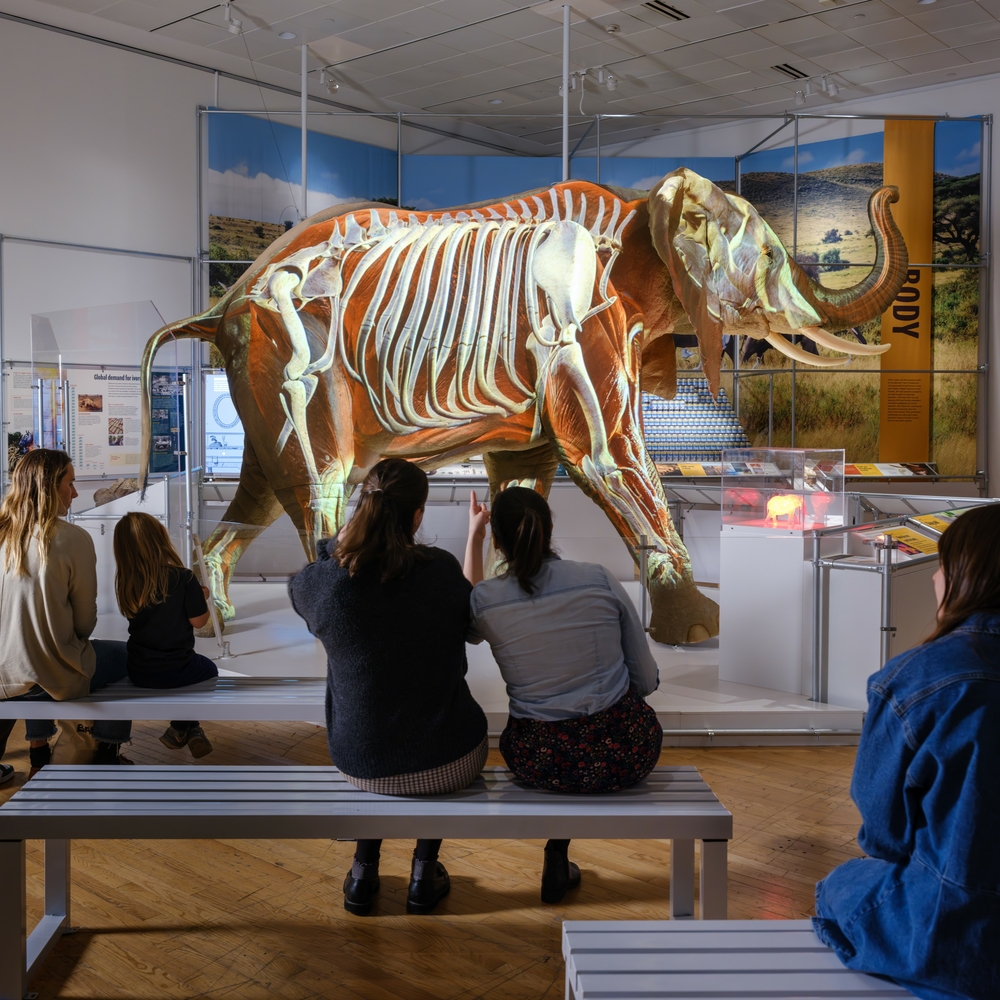 The exhibition features a life-size model of an African elephant—the largest living land animal.