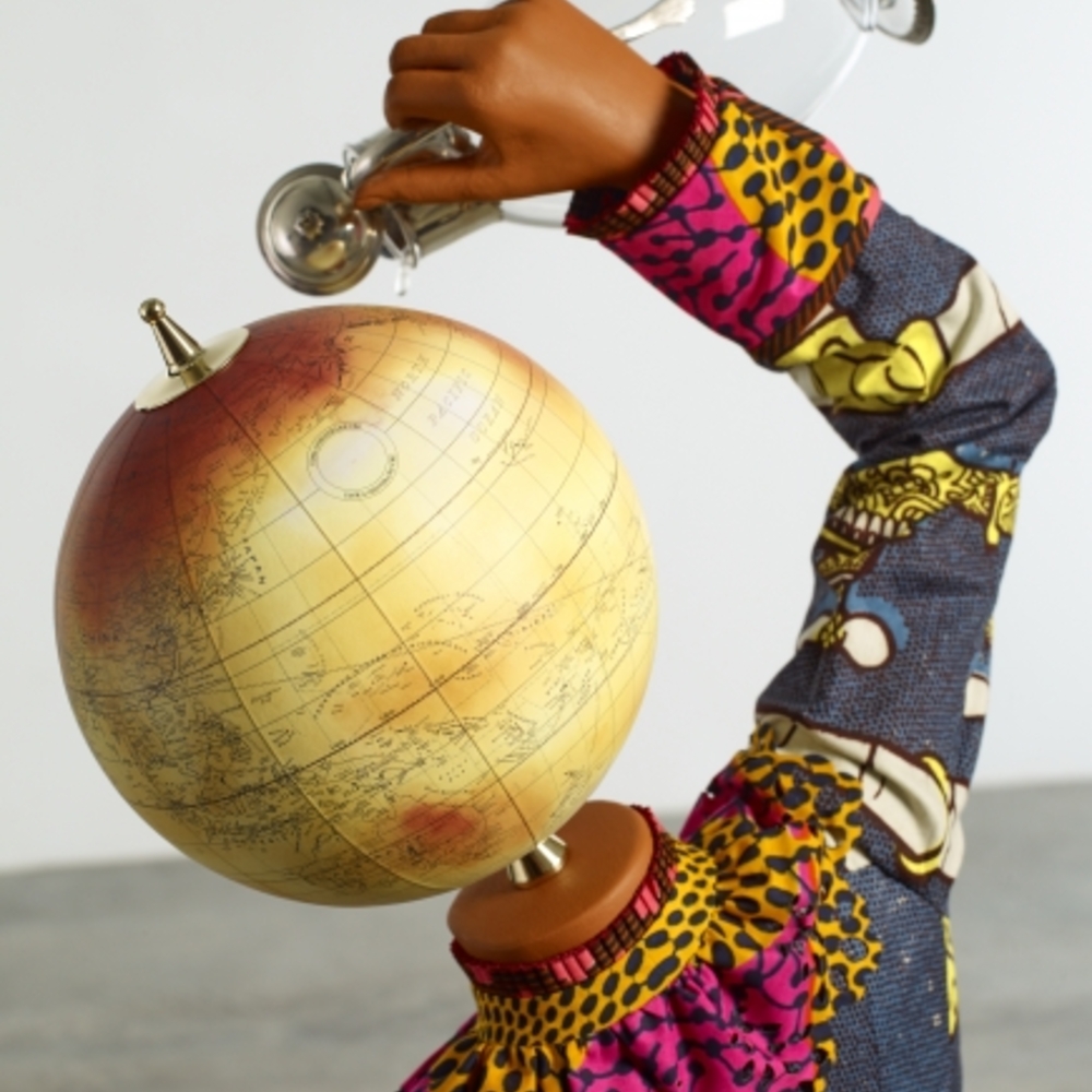 “Art, like philosophy,” says the British-Nigerian artist Yinka Shonibare CBE, “can start a debate and then can change thinking, and what we then hope is that that thinking becomes political, and then becomes policy.” In Earth Kids, Shonibare makes works that connect colonial domination to the exploitation of the natural world. Four sculptures represent the four elements: earth, air, fire, water. Each is the figure of a child—a fiberglass mannequin dressed in the Dutch wax-printed cottons, brightly-colored, that are worn in Africa. Their heads are globes of the Earth. And each is doing something relevant to their element. For instance, Water Kid holds a glass pitcher that pours out nothing. Earth Kid shoulders a fishing net full of plastic trash. These children—the future—suggest characters in folktales. Will ingenuity and rescue prevail? Or are these doomsday scenarios? —E.C.
