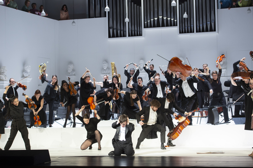 At the Deutsche Oper, Berlin, Tobias Kratzer’s sleek, antiseptic new take features not one dwarf but two, both dressed in a concert artist’s classic white tie and tails, leaving the gargoyle persona to the viewer’s imagination. The actor Mick Morris Mehnert, who is a little person, remains mute throughout. The strapping tenor David Butt Philip begins at a music stand, stage left, apparently “just a voice.” But it isn’t long before he moves in on the action, most startlingly as the Dwarf’s mirror image (or is it the other way around)?