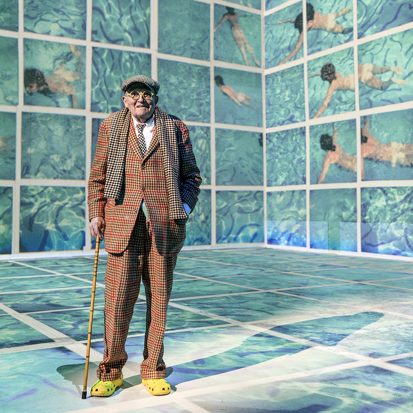Hockney has always been a natty dresser — a kind of carefully curated ostentation is how I would describe his style — and today is no exception. His hair is closely cropped and he wears a refulgent turquoise cardigan over a white shirt with a thin, op art, black-and-white checked tie. Brown tweed trousers and the now-fabled yellow Crocs complete the ensemble. The unusual element in the room is a small scaffolding structure in the corner, reaching to the ceiling, draped in black cloth, that contains the model for his latest extraordinary venture, David Hockney: Bigger & Closer (not smaller & further away).