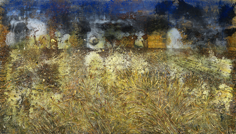 Kiefer keeps returning to fields (bad things happen in fields). An exhibition in Austria last fall, titled after the Medieval song “Under the Linden,” took inspiration from the autumn ruin of fields in Barjac, France, a beauty, Kiefer said, that reminded him of Eros and Thanatos. In “Field of the Cloth of Gold”—a show of four paintings that opens on February 7 at Gagosian in Paris—Kiefer is thinking about a meeting 500 years ago, which took place in a field where King Henry VIII and King Francis I met to broker peace. Within a year they were at war. One of the paintings, From Hearts and Brains the Stalks of Night Are Sprouting, is a trampled field of smoldering gold straw, rusted scythes lifted like the battle flags of invisible reapers. “Thy fibres net the dreamless head.”