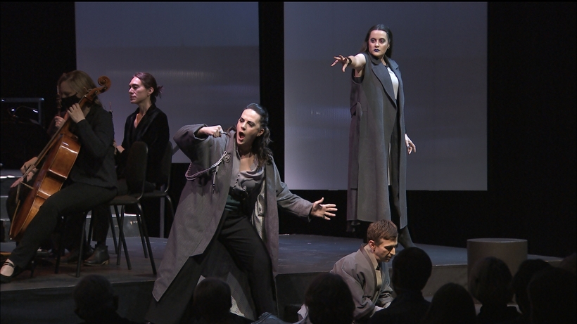 Between background projections and monochromatic, vaguely military costumes, Louisa Muller’s staging trusts above all in her players’ powers of histrionic suggestion. Sinister in purple lipstick, black nail polish, and eyeshadow like twin shiners, Melissa flutters her fingers or waves her arm, and her spell is cast, with victims caught in conditions of paralysis or agonized enchantment.