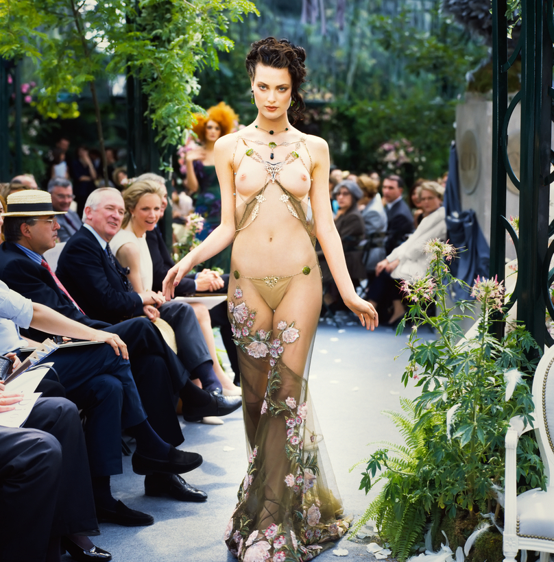 Galliano’s first couture show for Dior—spring-summer 1997—was held at the Grand Hotel in Paris, in a scaled-up reconstruction of the beautiful Dior salons on Avenue Montaigne. Soon, however, the soaring romance of his work demanded a larger stage. Galliano’s autumn-winter 1997–98 collection, based on Mata Hari, for example, was held in the romantic Bagatelle gardens, just outside of Paris. John’s gray flannel tweeds, inspired by his research of Christian Dior’s great Bar suits, were shown with long—long to the floor—thin skirts in matching tweed. The exaggeration of the collars; the small, nipped waists; and the hourglass effect of his peplum jackets, mixed with towering Edward S. Curtis inspirations in hair, were breathtaking. The diamanté sautoirs and giant earrings, inspired by African jewelry: they were never seen in haute couture. Stella Tennant wore extreme, yet refined, thin braids. Shalom Harlow brought the show to a climax when she came out completely nude but for a golden thong, under a long column of deft floral-embroidered silk.