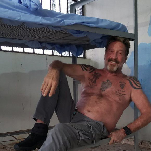McAfee the man, however, has resigned himself to the simpler pleasures of incarceration—new pals, knife fights, and navel-gazing. “I am content in here. I have friends,” he tweeted on October 15, and then two days later: “My cell mate is a Pakistani Muslim—a drug dealer. He said we are in prison because God is angry with us. That certainly explains much of my life.”