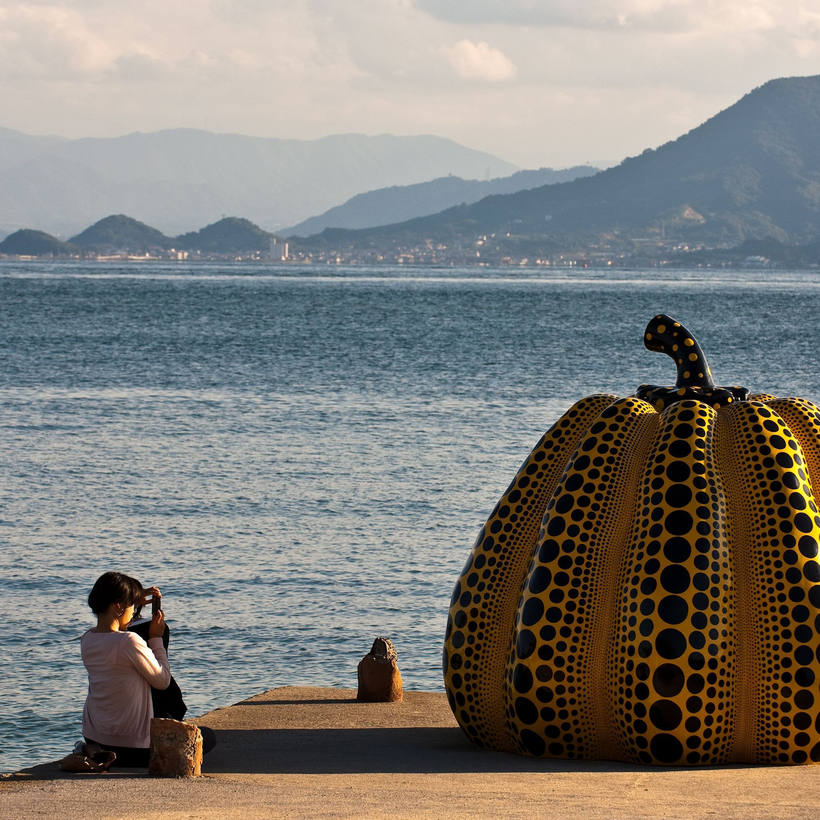 Home to the Chichu Art, Benesse, and Ando museums, the permanent collections in Naoshima include masterpieces by the likes of Claude Monet, James Turrell, and Walter De Maria. Sculptural works are scattered around the island with the same frequency as one might expect to encounter a park bench. A leisurely bike ride, the preferred mode of transportation, will casually bring you into intimate contact with Yayoi Kusama’s celebrated Pumpkin. (It is decidedly not the Kusama pumpkin that, in 2017, was fraudulently sold for $1.4 million by Angela Gulbenkian to a Hong Kong art consultant but never materialized. It does look similar, though.)