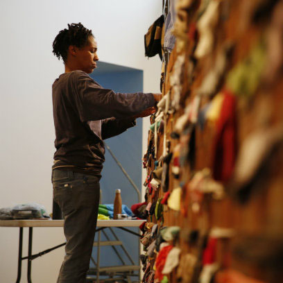 Upon entering her current solo show, at Tanya Bonakdar Gallery, one encounters Fortified, an imposing wall—12 feet high and 20 feet in length—made from steel and brick. Undercutting its stability, however, are colorful socks, sleeves, scarves, gloves, T-shirts, and shoestrings, which thread across the wall, between the bricks, in lieu of cement. These traces of teeming life invite viewers to ask what exists on the other side of this otherwise impassable piece.