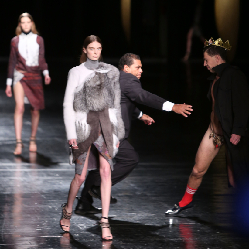 Four years later, at a Prabal Gurung show in New York, Vitalii Sediuk, a Ukrainian reporter who had previously pranked Will Smith, Gigi Hadid, and Kim Kardashian, jumped onto the runway in a black trench coat, which he unfastened to reveal a leopard-print thong.