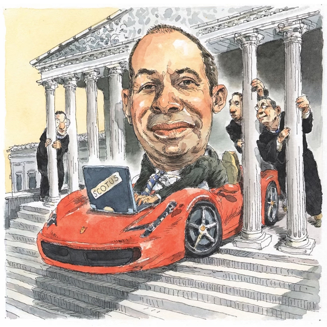 The 2012 Atlantic profile of Goldstein began with a brief anecdote about Goldstein shipping his brand-new 2011 black Ferrari 458 (price tag: approximately $250,000) to Las Vegas to race against Bilzerian’s 1965 Shelby Cobra for a bet. The accompanying illustration depicted Goldstein driving a Ferrari down the steps of the Supreme Court. After his indictment earlier this year, the author of the piece posted on X that Goldstein was “very unhappy that [she] exposed his gambling issues.”