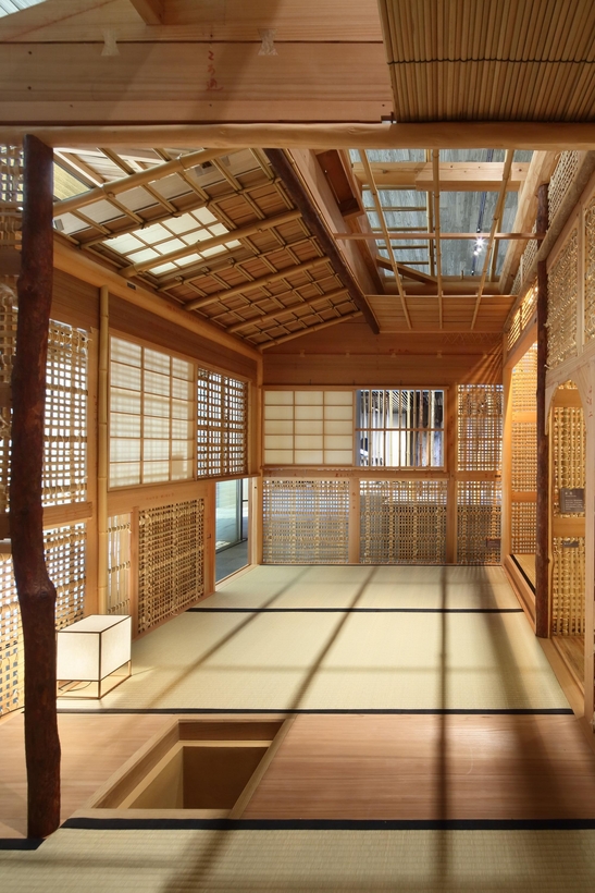 The show’s version of the Sa-an Teahouse was painstakingly hand-built by Akinori Abo, a master carpenter who is able to plane a wood shaving thinner than the thickness of a human hair. Usually working to a tolerance of absolute zero, for this project he took the unusual step of creating each joint with a small gap, almost invisible to the human eye, so that every piece could slide apart and then be re-assembled over the course of three weeks.