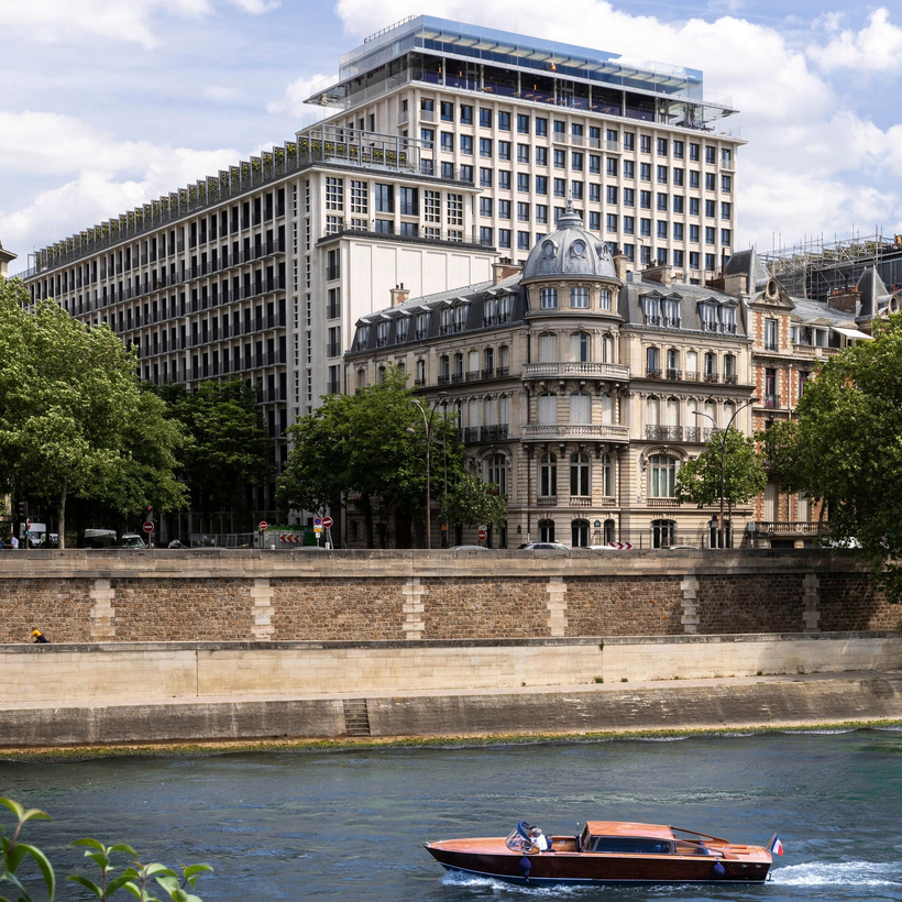Above all, SO/ Paris celebrates its proximity to the river. The building’s original columns have been newly encased in a white plume structure, evoking a fountain, while the lobby’s terrazzo walls are inscribed with a line delineating the water level during the great flood of 1910.