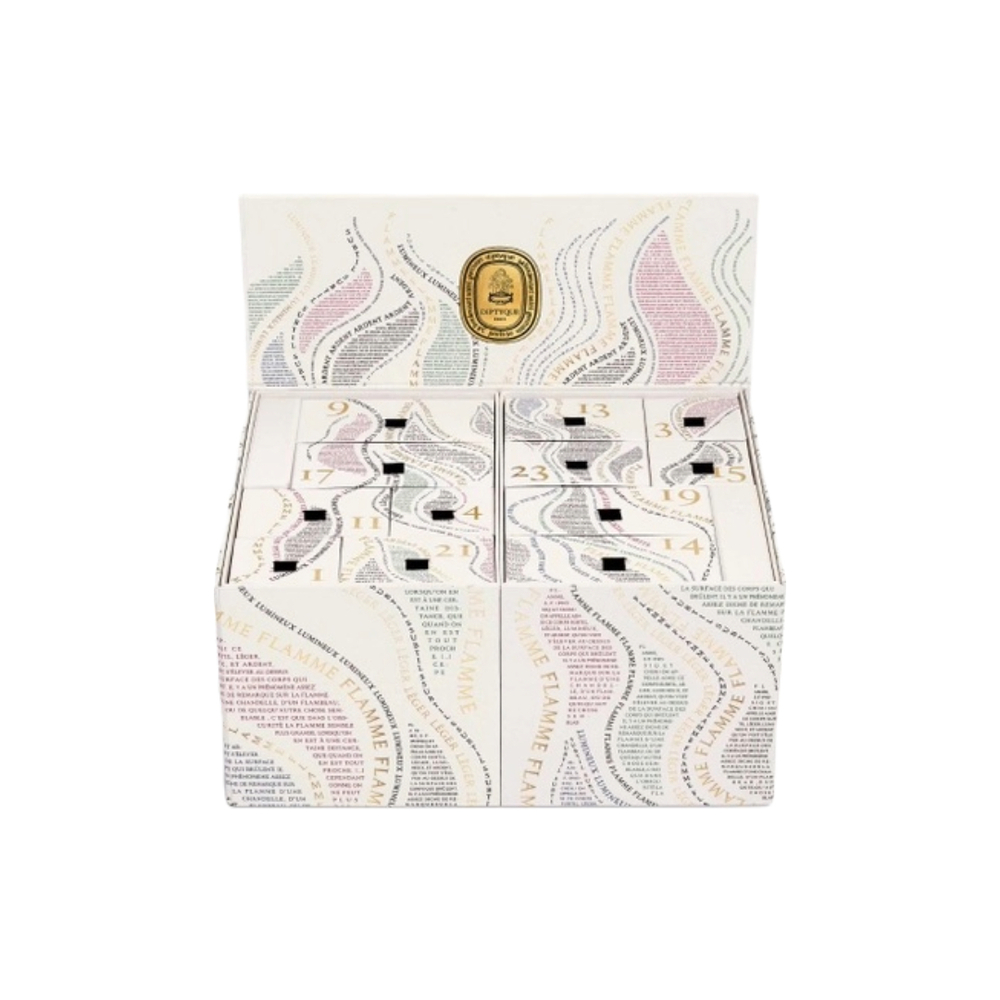 Diptyque touts their “majestic” package of 25 festive fragrances. Unfortunately, I can’t verify the majesty of the scents, as Diptyque insisted I return their samples unopened and unsampled. Still, I’m grateful to them for introducing me to the word “calligram,” which, if presented on my verbal S.A.T.’s, would have wrecked my perfect score. (Google tells me it’s a set of words arranged to form a thematically related image. ) The words drawn here—“flamme/lumineux” and “leger”—are meant to form flames, though to me they are vaguely gynecologic. Which may be the point. I’m convinced it’s clever subliminal advertising for the men purchasing these calendars for their loves.