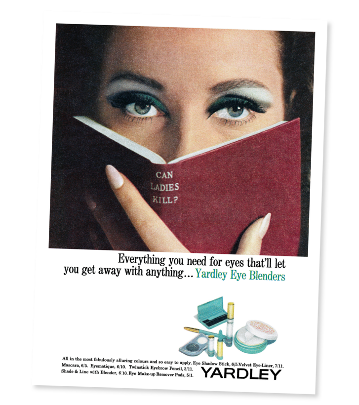 Eye shadow, lip gloss, and murder. It sounds like the tease for a film noir—and Yardley played up the femme fatale in its 1967 makeup ad with a prop, Can Ladies Kill?, a 1938 potboiler by Peter Cheyney. The most menacing part of this proposition might well be the frosted-blue eye makeup, which everyone knows is deadly. Or else it’s the suggestion that the look is easy to duplicate, a myth with its own degree of danger. You slay. —Linda Wells