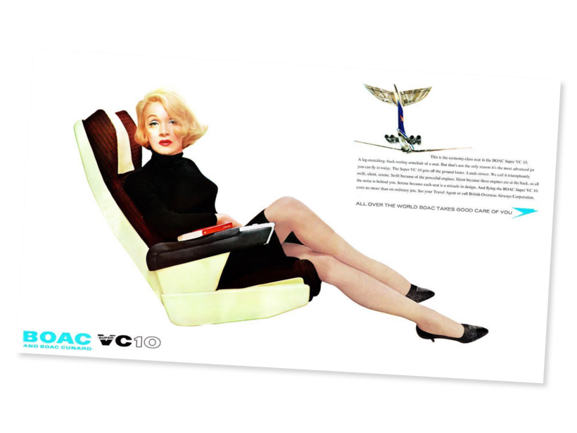 An airline could do worse than to hire Marlene Dietrich to demonstrate its cabin’s expansive legroom. But BOAC (British Overseas Airways Corporation) took it one step further and stuck her—and those million-dollar legs, as insured by Paramount—in economy for this 1965 ad. In a later version, it replaced the actress’s racy heels with a pair of sensible loafers. Because of Dietrich’s anti-Nazi stance during W.W. II, the ads never ran in Germany. —Linda Wells