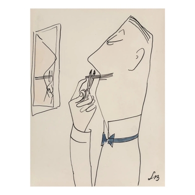 Debonair Man Cuts His Mustache in Front of Mirror, 1950s.